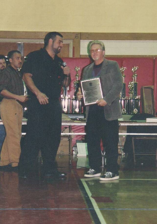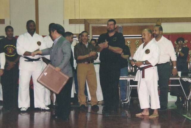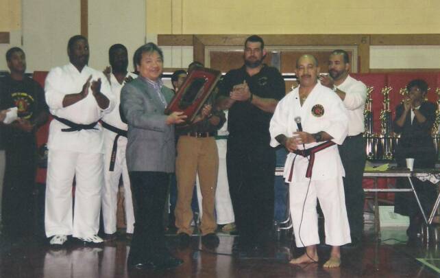 Kyoshi Anthony Lau receives an award from Sensei John Benedict.