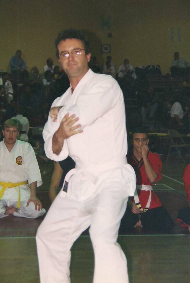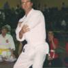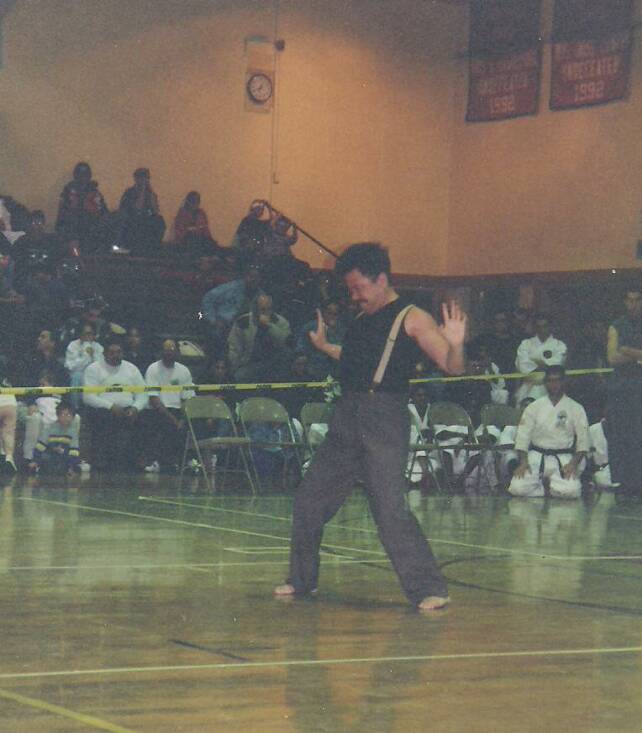 Yudansha/Sensei William Louie performs kata (left), then receives an award from Sensei John Benedict (right).