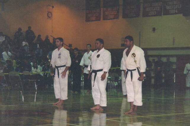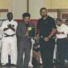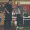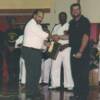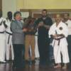 Sensei Nelson Melendez (left) and Yudansha Hanson (right) receive awards from Sensei John Benedict.